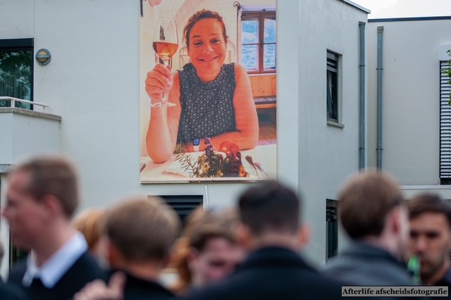 Na afloop was iedereen, zoals Esther wilde, uitgenodigd om bij haar thuis samen het glas te heffen op het leven, op Esther haar leven. Vanaf haar huis keek Esther naar ons, met een glas in haar hand en een stralende lach op haar mond.